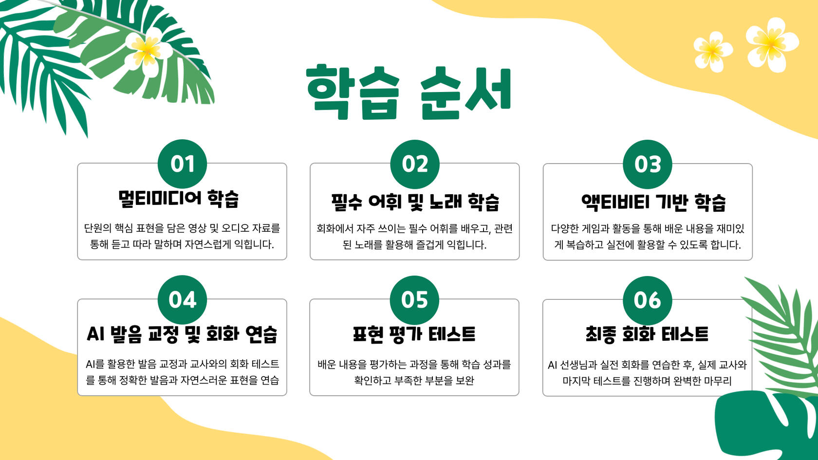 문장 단위 구조화된 학습: 자유 대화가 아닌, 정확한 문장 사용을 통한 말하기 훈련